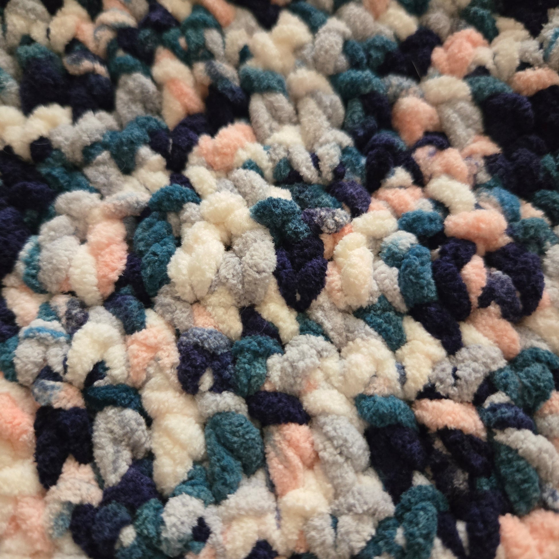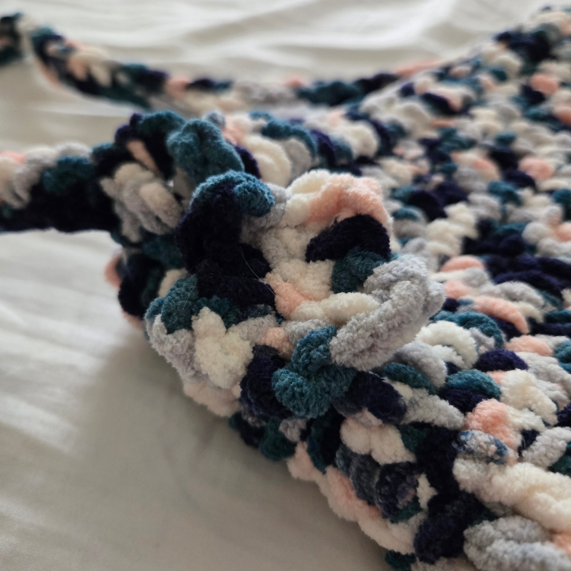 Handmade crocheted bag with a hand-crocheted flower Keychain. Long strap for over the shoulder support or a long hang. Tightly hooked yarn so even small things won't slip out. Soft plush yarn with white, light pink, light blue, teal, and dark blue colors.