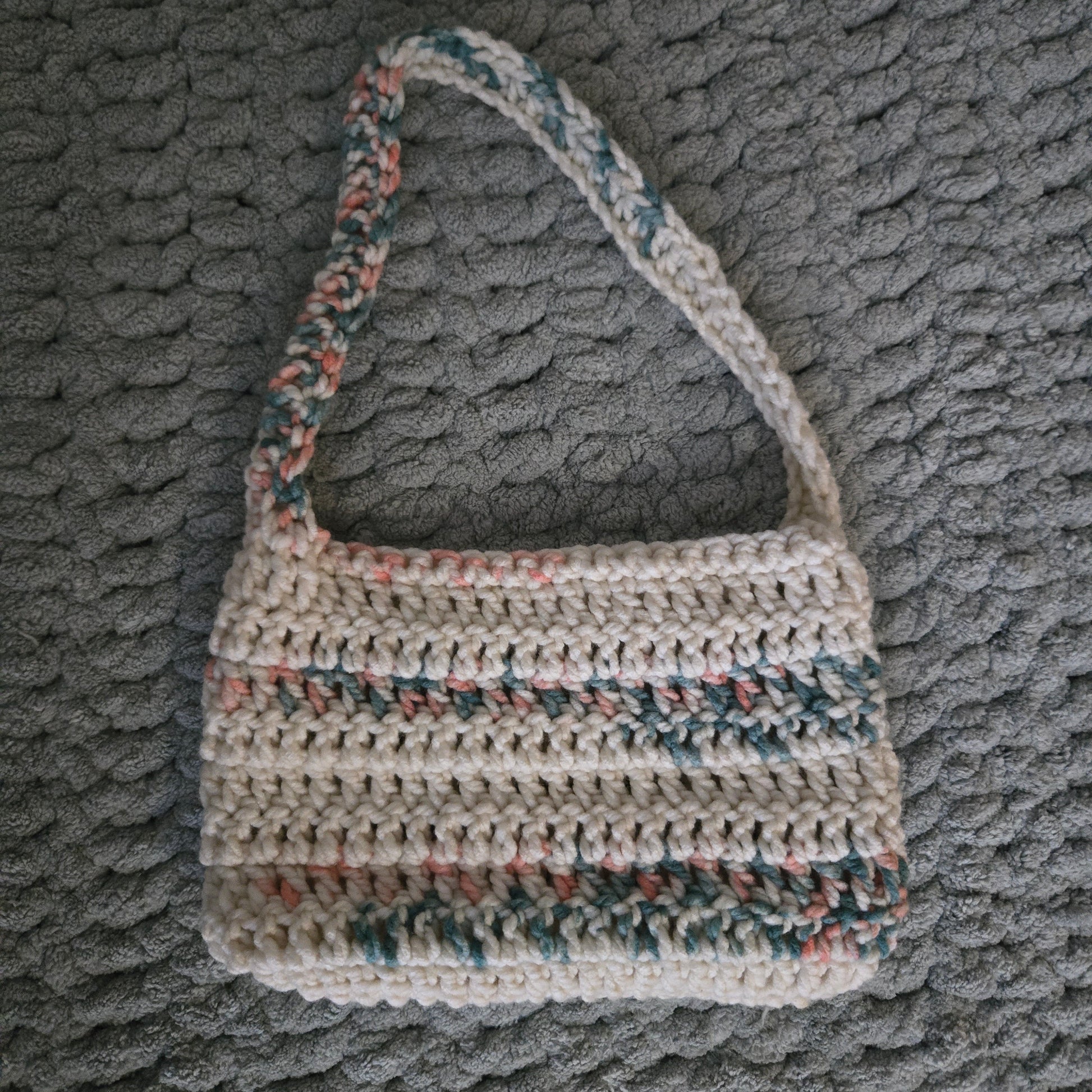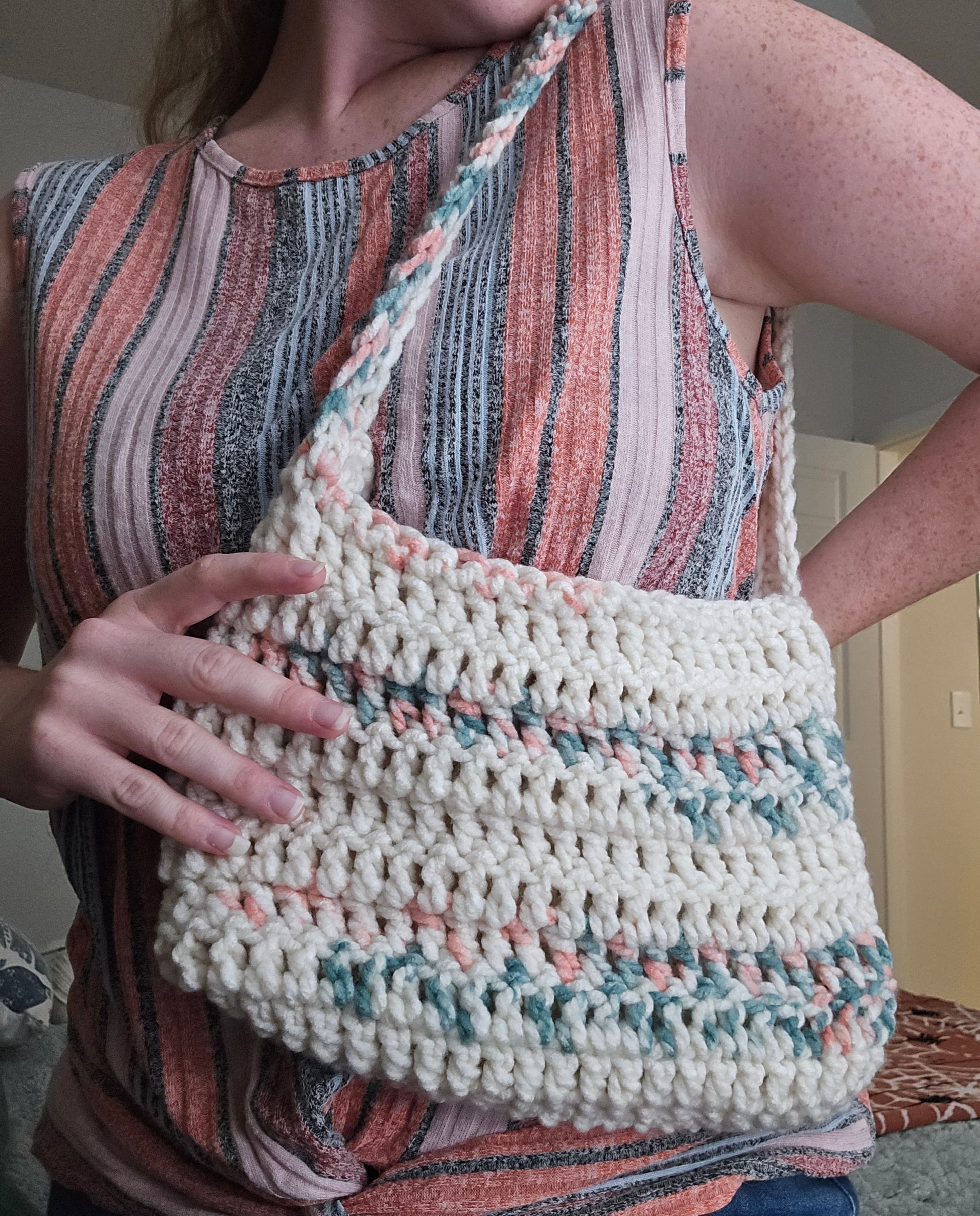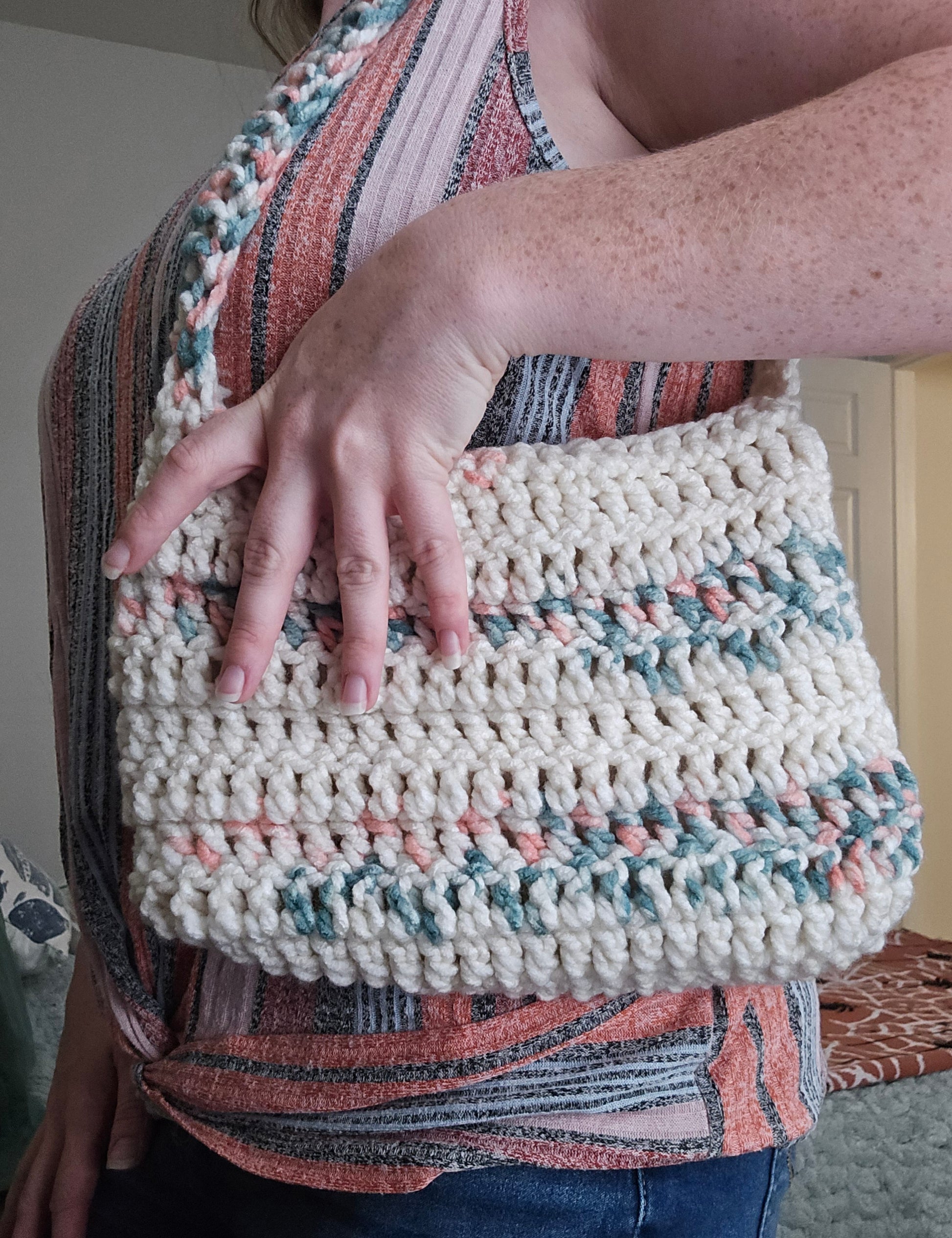 Hand-crcoheted bag using chunky 100% acrylic yarn.
