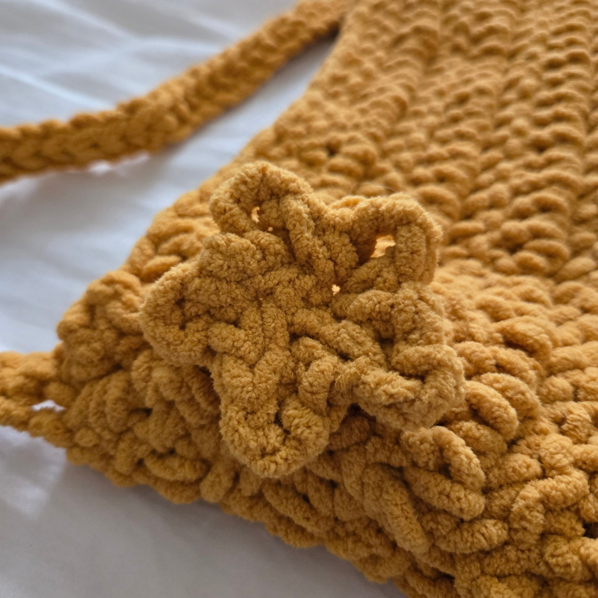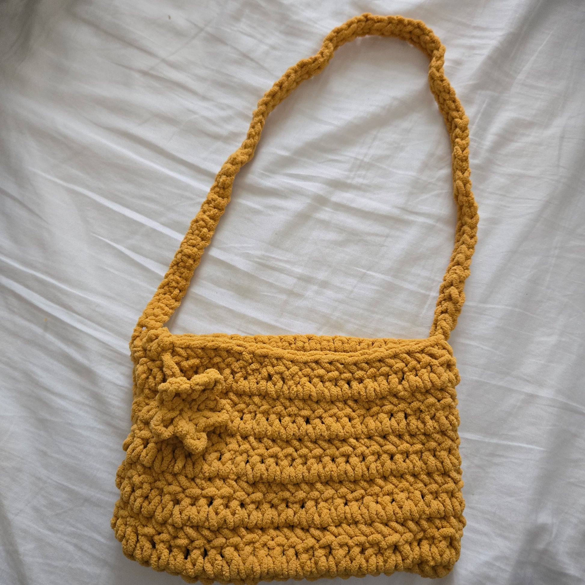 Handmade crocheted bag with a hand-crocheted flower Keychain. Long strap for over the shoulder support or a long hang. Tightly hooked yarn so even small things won't slip out. Soft plush yarn with mustard yellow color.