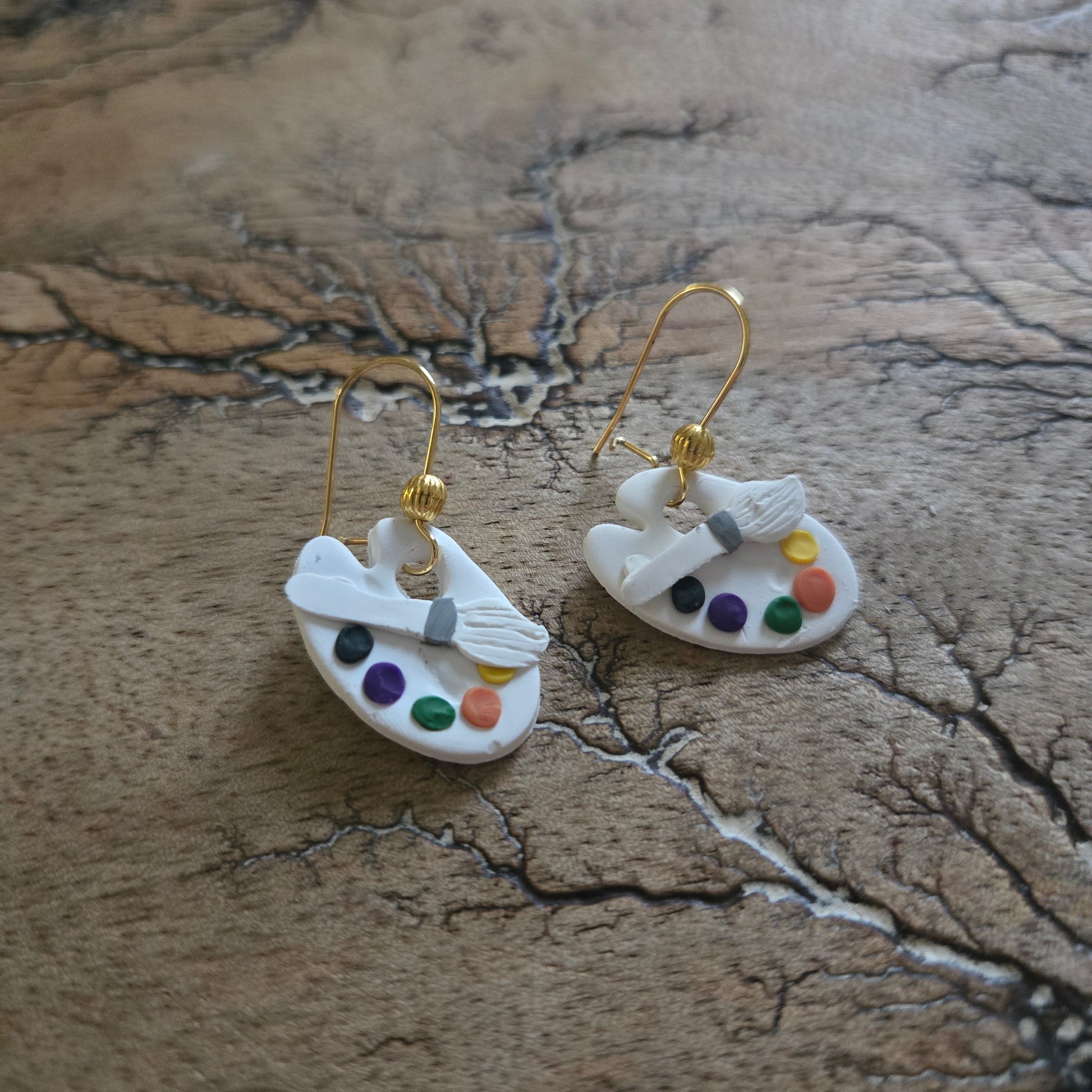 Paint pallet earrings with fun colors and a paint brush. Made using polymer clay and light weight. Hand-painted.