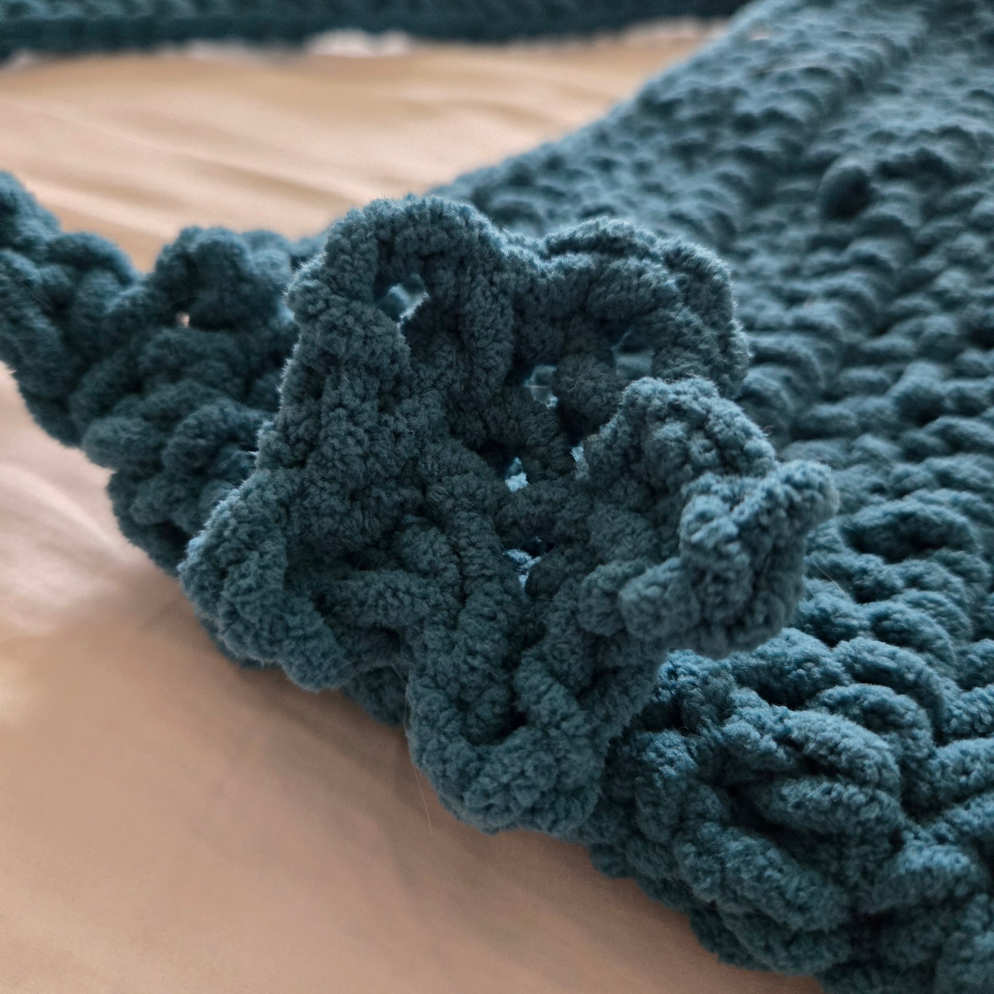 Handmade crocheted bag with a hand-crocheted flower Keychain. Long strap for over the shoulder support or a long hang. Tightly hooked yarn so even small things won't slip out. Soft plush yarn with dark teal color.